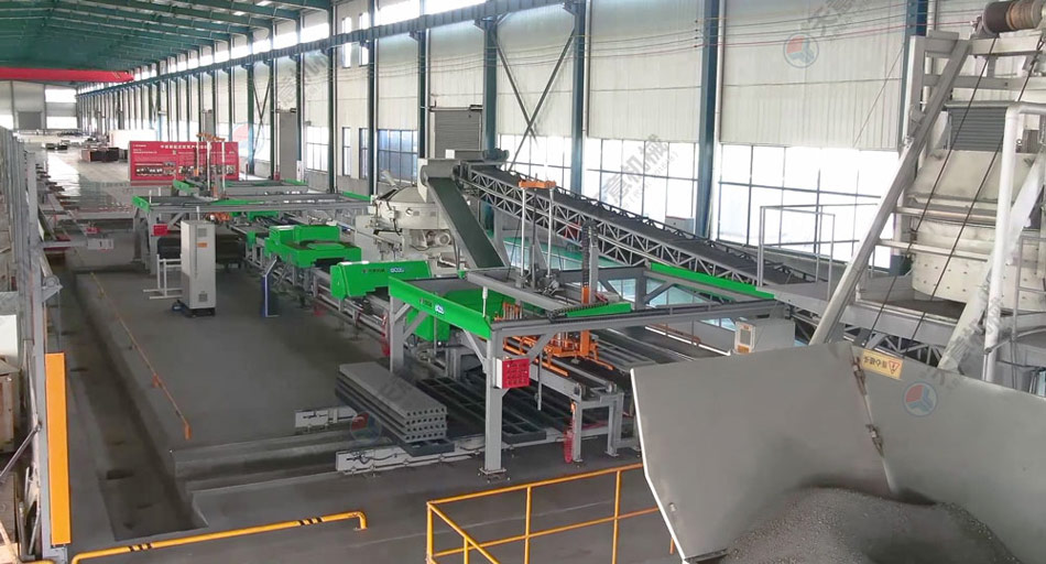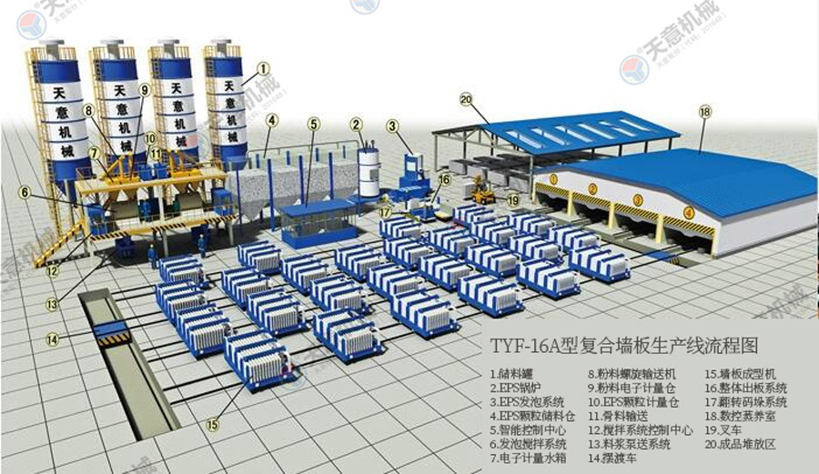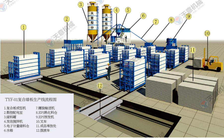 TY12型墻板生產(chǎn)線包括:墻板成型機(jī)、整體穿抽管系統(tǒng)、發(fā)泡系統(tǒng)、水箱、電子計量儲料倉、螺旋上料輸送機(jī)、儲料罐、螺旋輸送機(jī)、EPS熟化料倉、硫化干燥床、EPS預(yù)發(fā)機(jī)、數(shù)控配電室、發(fā)泡攪拌機(jī)、整體出板系統(tǒng)、叉車、成品堆放區(qū)、擺渡車。